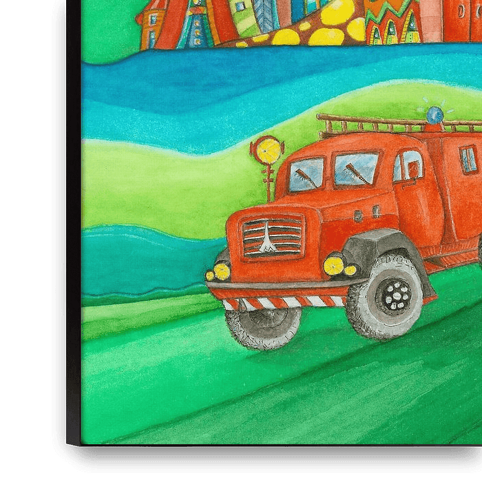 Bestelle dieses abstrakte Wandbild Feuerwehr Stadt von Sonja Mengkowski als Reproduktion auf Leinwand, Alu-Dibond, als Poster, Fototapete oder Acrylglasbild.