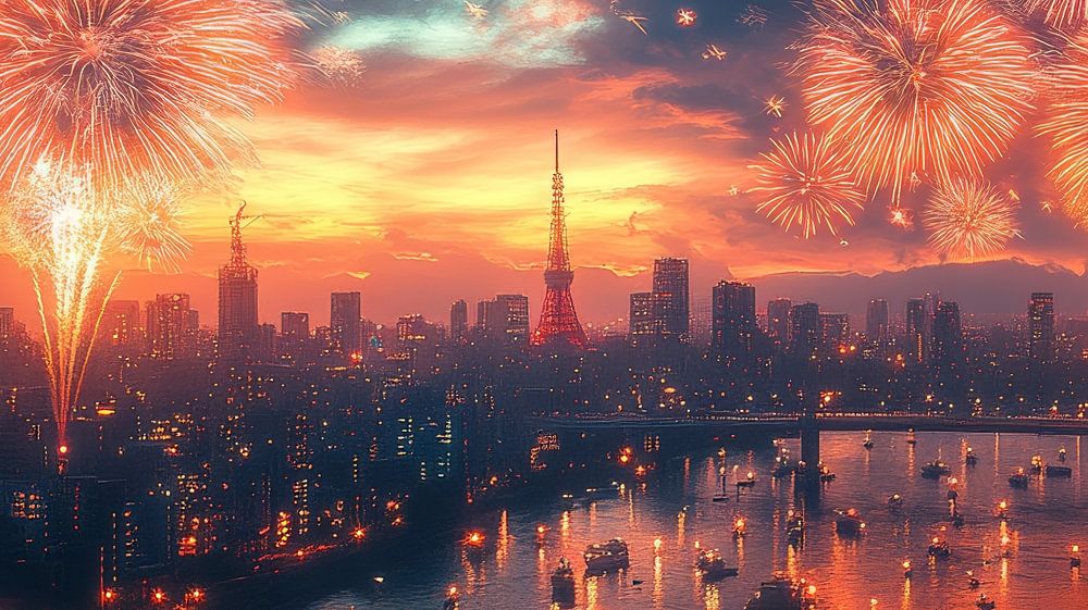 Ein atemberaubendes Fest des Lichts und der Farben: Ein Feuerwerk erhellt die Skyline einer pulsierenden Stadt. Die glühenden Reflexionen tanzen auf dem Wasser und schaffen eine perfekte Harmonie aus städtischer Schönheit und Festlichkeit. Dieses Kunstwerk fängt die Magie einer besonderen Nacht voller Freude und Wunder ein.