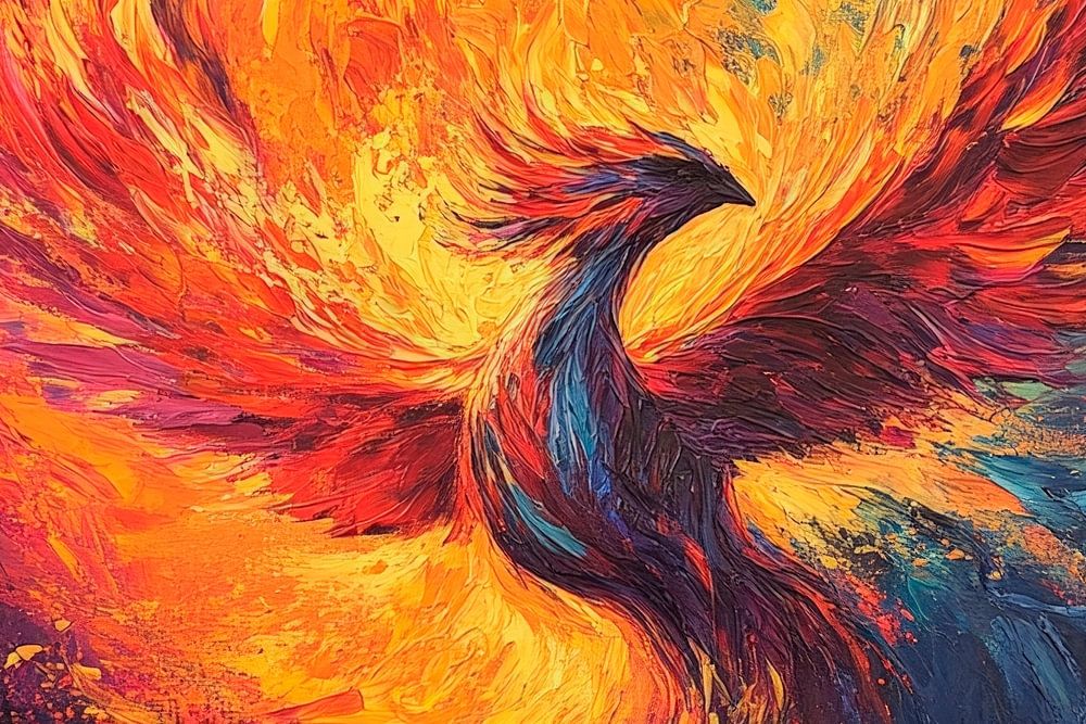 In einem leidenschaftlichen Spiel aus leuchtenden Rottönen und goldenem Glanz erhebt sich majestätisch ein Phönix aus den Flammen, symbolisch für Wiedergeburt und Stärke. Diese kraftvolle Komposition eignet sich perfekt für das Wohnzimmer, wo sie Energie und Inspiration verbreiten kann, während sie das Herz eines jeden Betrachters erwärmt.