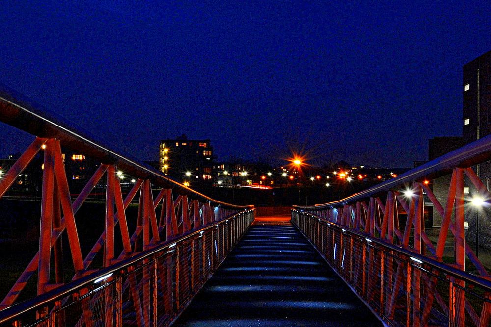 De fietsbrug over de rondweg, gezien vanaf het fietspad langs het Amsterdam Rijnkanaal richting het Schoneveldsepad in de wijk De Muur in Houten Zuid-West.