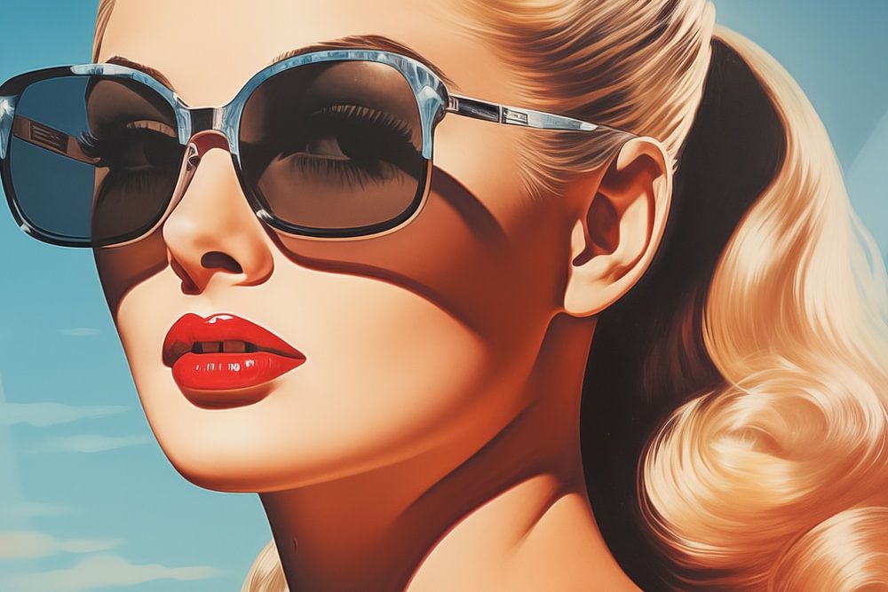 Filmplakat aus den 1950er Jahren, das eine schöne 40-jährige blonde Frau mit Sonnenbrille und Pferdeschwanz im Retro-Vintage-Kunststil zeigt