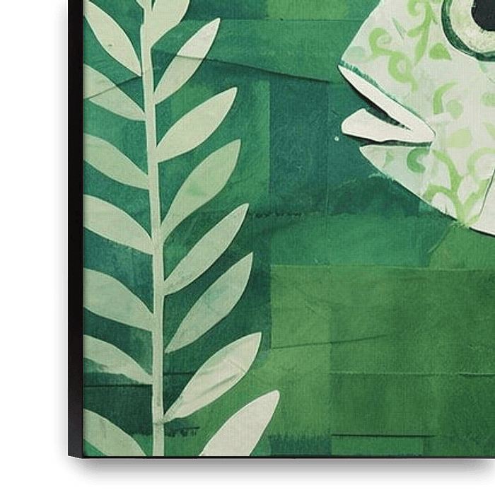 Fish Abstract | Fish - Das Gemälde zeigt einen stilisierten Fisch, der sich aus einem Mosaik von Grüntönen zusammensetzt und einen ruhigen und doch lebendigen Eindruck hinterlässt. Der abstrakte Fisch steht vor einem Hintergrund aus blockigen, wässrigen Strukturen und spiegelt einen spielerischen Ansatz zum Thema mit einem klaren…
