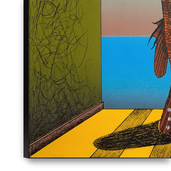 Eine farbenfrohe grafische Lithografie eines Fisches, der in einem Raum steht.