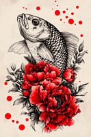 Ein kraftvoller Karpfen schwebt majestätisch über einer üppigen Wolke roter Pfingstrosen. Die lebendige Farbenpracht der Blüten kontrastiert mit der filigranen Schwarz-Weiß-Darstellung des Fisches. Spritzige rote Punkte verleihen dem gesamten Bild einen dynamischen Rhythmus und harmonisieren Natur und Kunst auf faszinierende Weise.