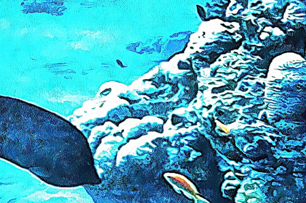 Das letzte Bild einer Serie von stilisierten Fotokunstwerken von Fischen und Korallengruppen an einem Korallenriff in Indonesien. Warme Gewässer, in denen es von Leben wimmelt, aber das Foto, auf dem dieses Bild basiert, wurde von mir vor über 30 Jahren aufgenommen. Ich frage mich, wie das Riff jetzt aussieht?