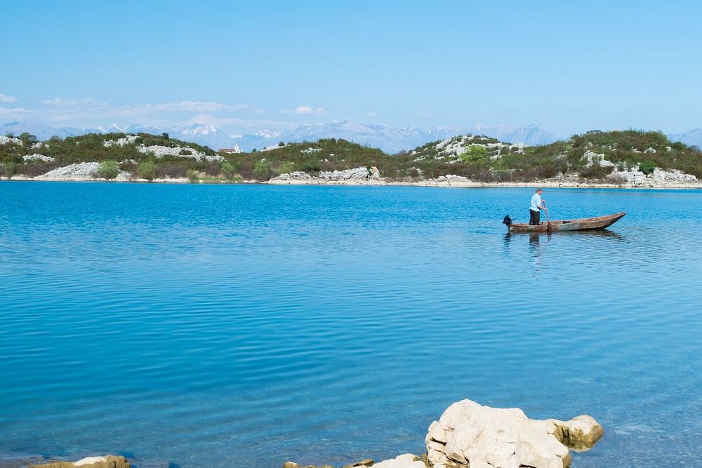 Der blaue See von Skadar mit seinen weißen Stränden und einem Fischer in einem kleinen Boot.