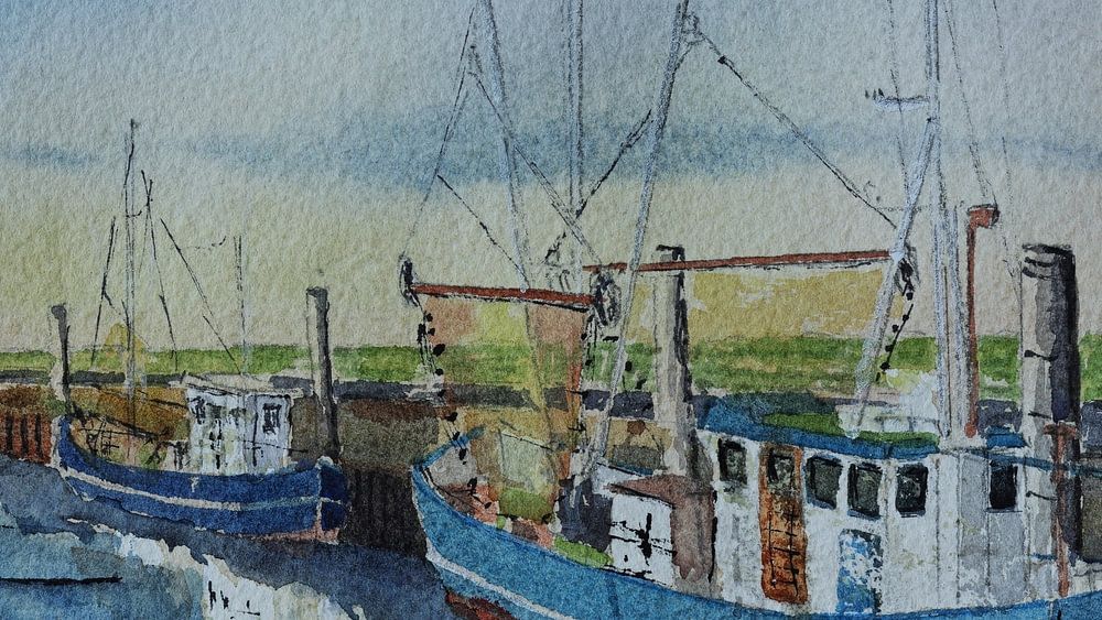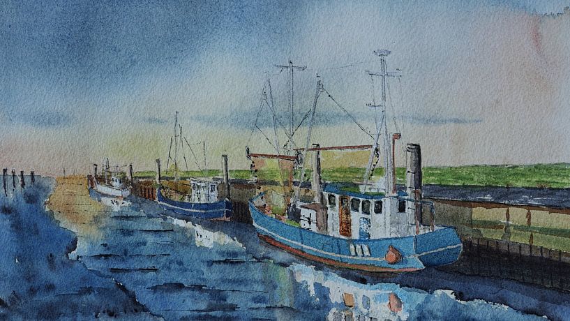 Bestelle diese Malerei Fischerboote im Heimathafen von Bert Groenhagen als Reproduktion auf Leinwand, Alu-Dibond, als Poster, Fototapete oder Acrylglasbild.
