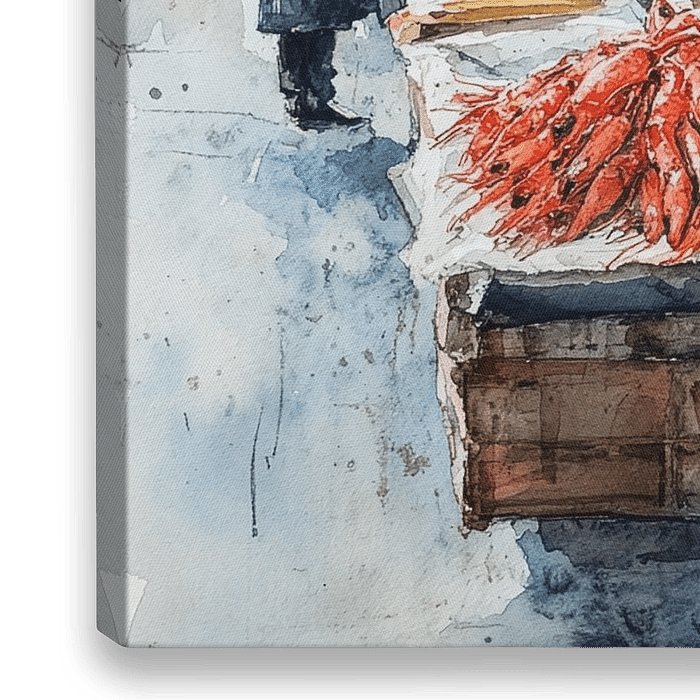 Dieses Motiv zeigt eine lebendige Auswahl an frischem Fisch und Meeresfrüchten, von glänzenden Garnelen bis hin zu kräftigen Krabben, wobei jedes Detail sorgfältig ausgearbeitet wurde, um die Energie des Marktes zu vermitteln. Eine einsame Gestalt steht in stiller Kontemplation da und fängt den alltäglichen Charme dieser lebhaften Szene…