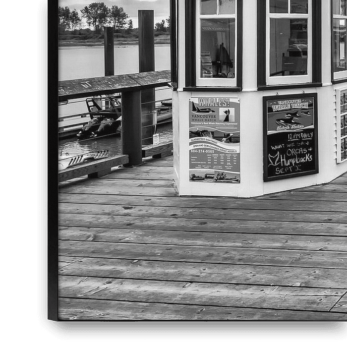 Bestelle das Foto Fisherman's Wharf in Steveston, Richmond | Monochrom von Melanie Viola als Reproduktion auf Leinwand, Alu-Dibond, als Poster, Fototapete oder Acrylglasbild.