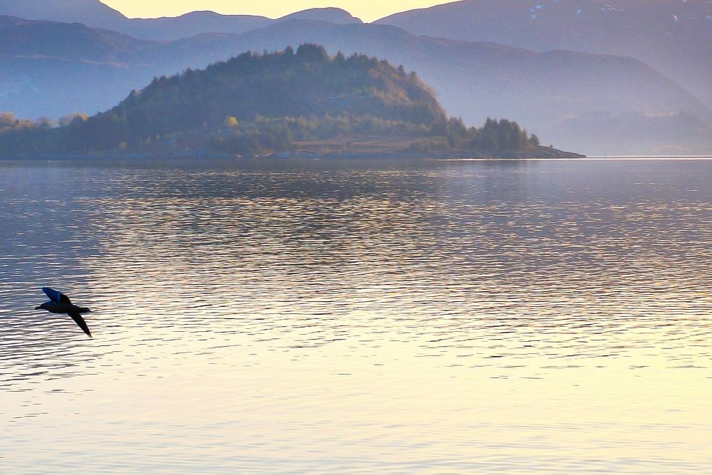 Fjord in Norwegen. Fjord und Meer zum Sonnenuntergang mit Bergen an der Küste. Raue Natur in Skandinavien