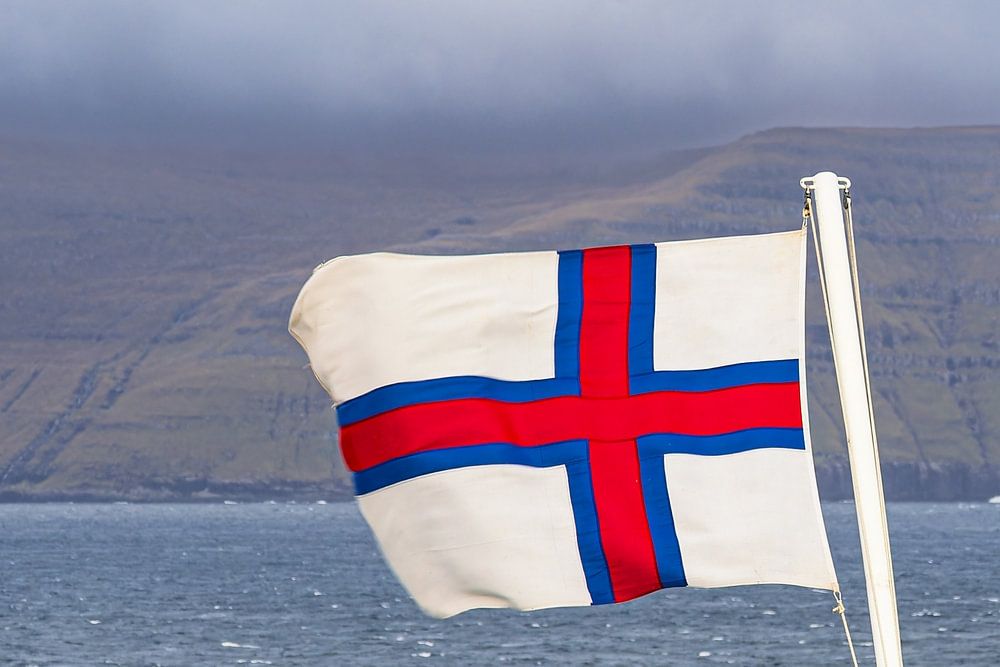 Flagge vor den Felsen der Färöer Inseln mit Wolken.