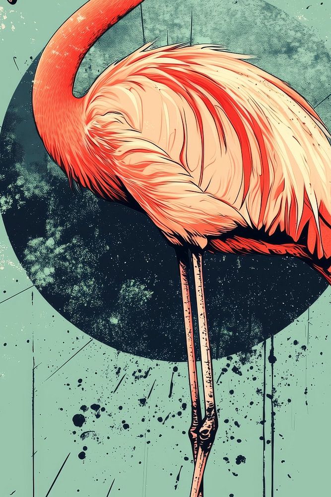 Ein anmutiger Flamingo steht im Mittelpunkt dieser modernen Kunstkomposition, die sich vor einem verwitterten türkisfarbenen Hintergrund mit einem Kreis aus kontrastierendem Dunkelblau abhebt. Zarte Pinselstriche im Gefieder akzentuieren warme Rosa- und Orangetöne und verleihen dem Vogel ein lebendiges, fast surreales Aussehen. Die abstrakten Texturen und tropfenförmigen Details verstärken das künstlerische Flair und machen dieses Stück zu einer perfekten Wahl für ein eklektisches oder minimalistisches Interieur, das die Schönheit der Natur auf einzigartige Weise zelebrieren möchte.
