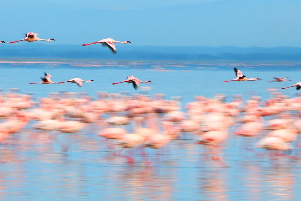Fliegende Flamingos in Kenia.