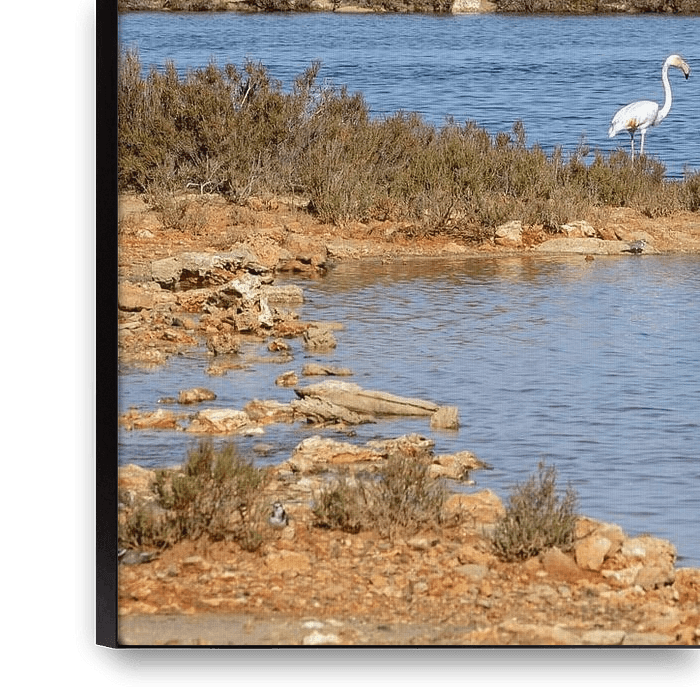 Bestelle dieses Landschafts-Wandbild Flamingos in den Salinen am Es Trenc (Mallorca) von t.ART als Reproduktion auf Leinwand, Alu-Dibond, als Poster, Fototapete oder Acrylglasbild.