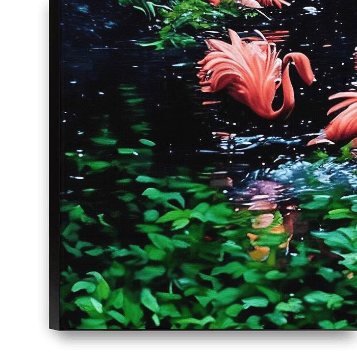 Eine heitere Szene mit leuchtend rosafarbenen Flamingos, die in einer üppigen, grünen Lagune, umgeben von dichtem Laub, waten und interagieren. Das Wasser spiegelt ihre eleganten Formen wider und schafft eine harmonische Verbindung zwischen Natur und Tierwelt.