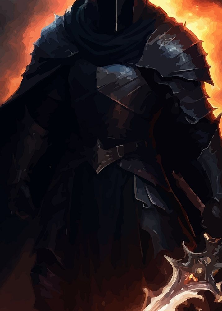 Schwarzer Ritter hält Fantasy-Schwert in Flammenaura