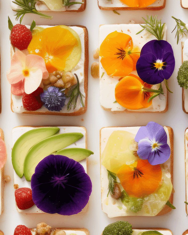 Über "Flatlay von organisierten Crackern mit leckeren Dingen und essbaren Blumen"