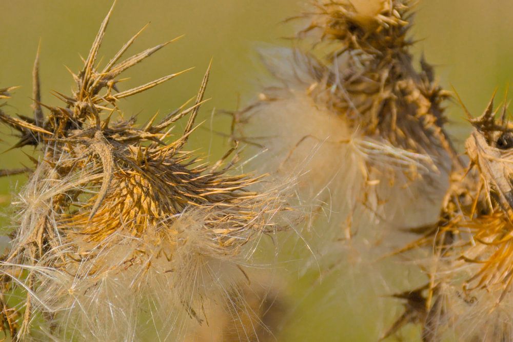 Nahaufnahme der Samen einer abgestorbenen Distelblüte
