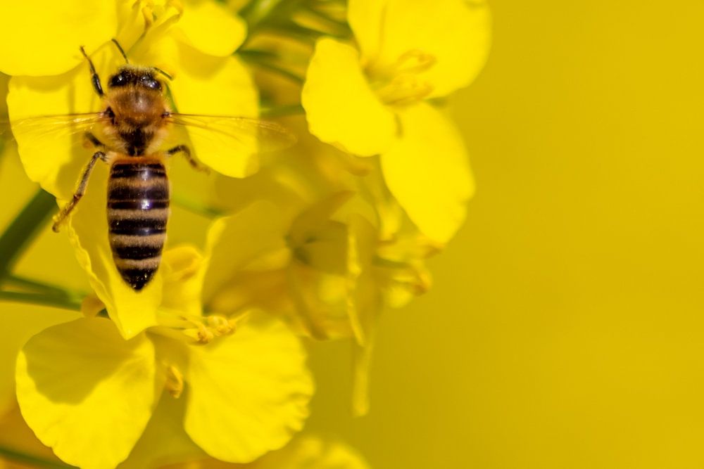 Das gelbe Paradies aus zarten Rapsblüten verschwimmt zu einem positiv-gelben Hintergrund und setzt den Fokus auf die fliegende Biene beim Pollensammeln.