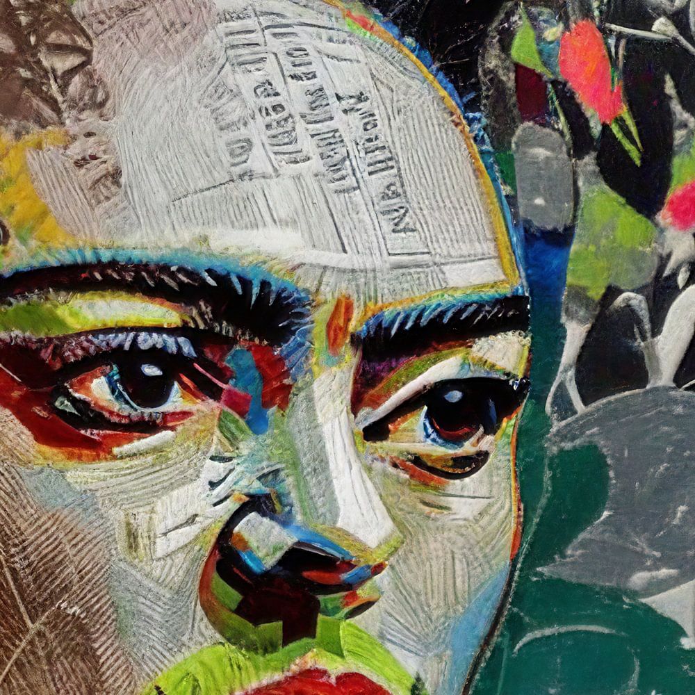 Der Hintergrund des Porträts ist eine kunstvoller Collage aus verschiedenen Materialien und Texturen. Es gibt Anspielungen auf Fridas mexikanische Herkunft und künstlerische Inspirationen, darunter traditionelle Blumenmuster, folkloristische Elemente und surrealistische Details.
