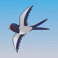 Eine digitale Vektor-Illustration einer niedlichen, im Cartoon-Stil gehaltenen Rauchschwalbe, die durch die Luft fliegt. Er fliegt in einem lederblauen Himmel. Sommerliches Bild.