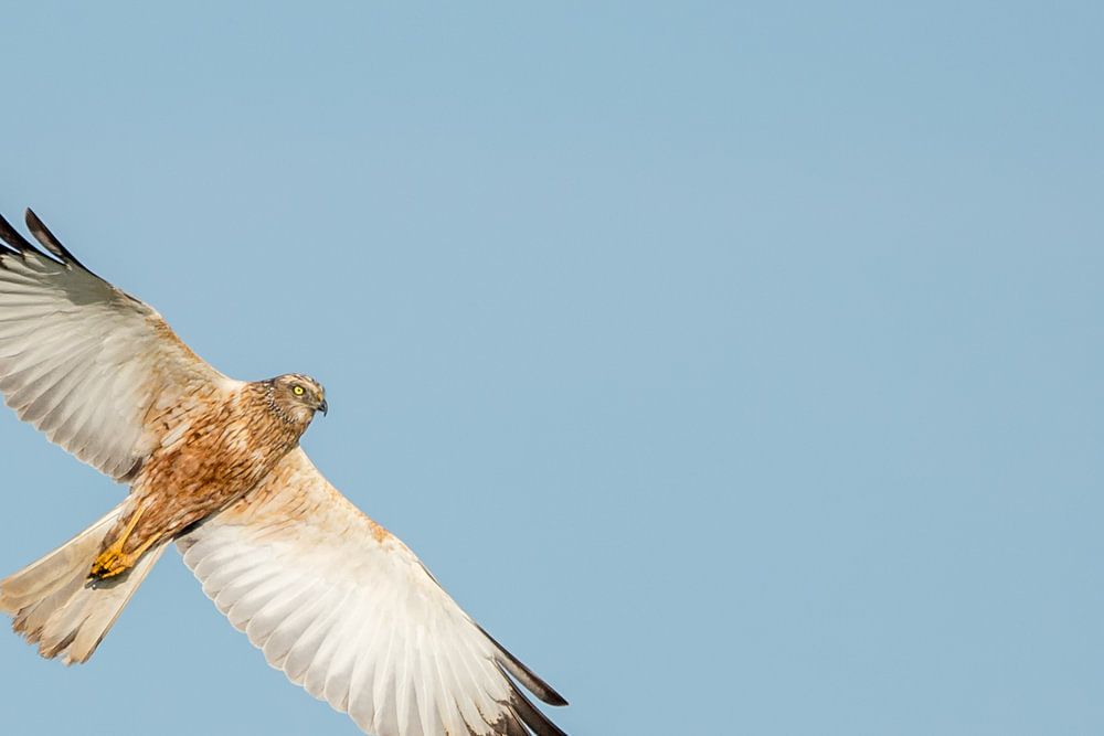 Schönes, klares Bild einer braunen Rohrweihe. Die Sonne erhellt die Federn dieses Mannes schön. Der einheitliche blaue Himmel rundet das Bild ab.