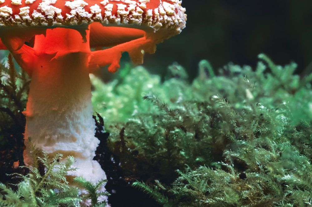 Magisch leuchtende Pilze vor einem dunstigen Waldhintergrund. Rot und weiß gefleckte Fliegenpilze, die als Schlafzimmerlampen leuchten. Fantasielandschaft mit beleuchtetem Pilz vor dunklem Hintergrund und zwischen grünem Moos. Nicht nur schön in der Natur, sondern auch inspirierend und stimmungsvoll in Ihrem Interieur, Büro oder Arbeitsumfeld als Fotodruck, Tapete oder Dekoration.