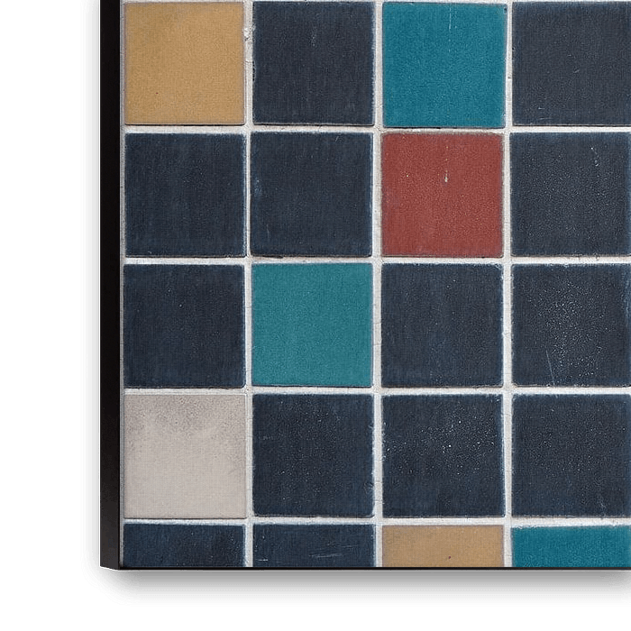 unterer Teil der Fassade eines Wohnhauses in Berlin mit einer Verkleidung aus farbigen Fliesen als Schutz vor Verschmutzung durch Schmutz und Spritzwasser von der Straße.