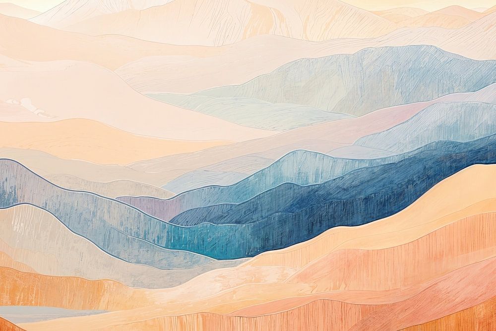 Eine bezaubernde abstrakte Berglandschaft, in der warme Orange- und Pfirsichtöne harmonisch mit kühlen Türkis- und Indigoblautönen verschmelzen. Die fließenden Linien und sanften Übergänge erzeugen eine verträumte, fast mystische Atmosphäre, die an einen Sonnenaufgang in einer Bergregion erinnert, eingefangen in einem modernen, minimalistischen Stil.