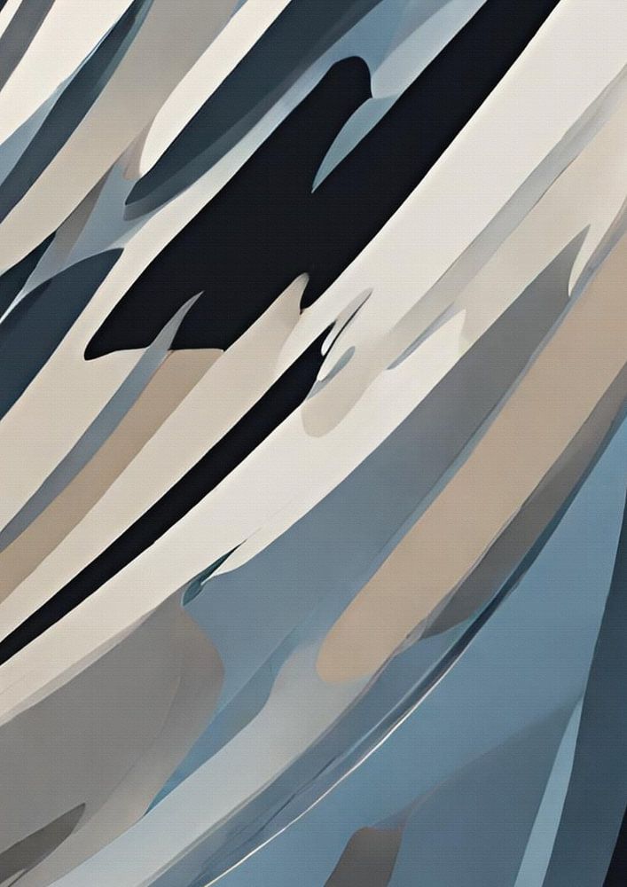 Fließende Linien und Formen, die den Eindruck von Bewegung und Fluss vermitteln. Die Farben Blau, Weiß und Grau gehen fließend ineinander über und vermitteln den Eindruck einer kontinuierlichen Bewegung. Die Linien scheinen über die Leinwand zu tanzen, fast wie Wellen.