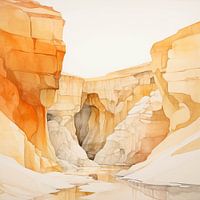 Dieses wunderschöne Aquarell zeigt eine tiefe, trostlose Wüstenschlucht in einem malerischen Stil mit blassem Weiß und hellen Orangetönen. Es ähnelt einer webbasierten Kunstkreation und strahlt ein Gefühl von Gelassenheit und Trostlosigkeit aus.