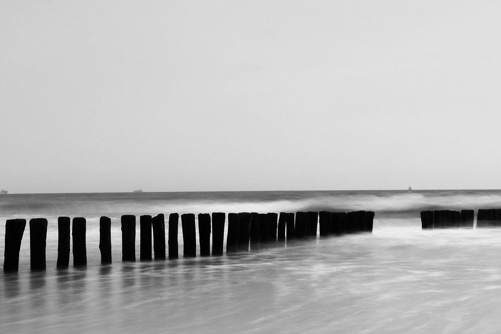 Schwarz-Weiß-Fotografie des fließenden Meeres am Strand in Cadzand. Das Foto wurde an einem regnerischen Abend aufgenommen.