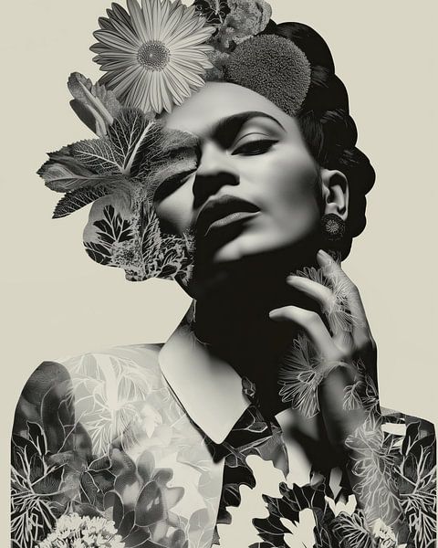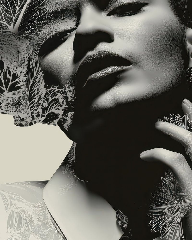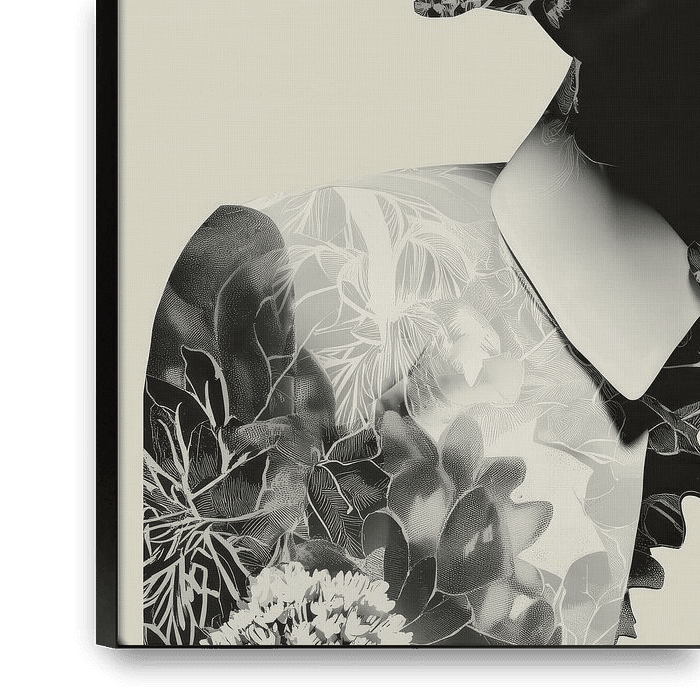 Ein eindrucksvolles Schwarz-Weiß-Porträt, bei dem botanische Formen mit der Figur verschmelzen und die Grenze zwischen Mensch und Natur verschwimmen. Der hohe Kontrast und die zarten Texturen vermitteln Stille, Intimität und ein Gefühl von zeitloser Eleganz.