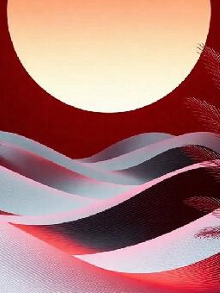 Dieses auffällige abstrakte Kunstwerk zeigt eine große, leuchtend orangefarbene und gelbe Sonne, die einen karminroten Himmel dominiert. Darunter befinden sich stilisierte Hügel oder Dünen, die abwechselnd in tiefem Rot und kräftigem Weiß gehalten sind und einen starken Kontrast und Rhythmus erzeugen. Zwei zarte, dunkle Silhouetten von Bäumen oder Laub stehen auf beiden Seiten und verleihen der ansonsten minimalistischen und dramatischen Landschaft einen Hauch von natürlicher Eleganz. Der Gesamteindruck ist von ruhiger Kraft und fesselnder Schönheit und erinnert an einen stilisierten japanischen Sonnenuntergang oder eine traumhafte Wüstenszene.