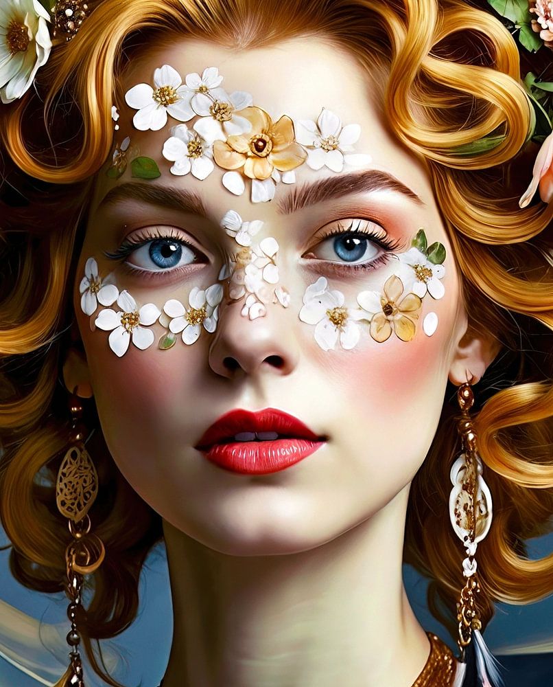 "Floral Muse", eine surreale Vision, die sowohl nostalgisch als auch zeitgenössisch wirkt. Eine Frau mit einem von zarten Blumen geschmückten Gesicht, umgeben von einem Kranz aus bunten Blättern, Blumen und Federn. Ihre feuerroten Lippen und ihre strahlend blauen Augen ziehen den Betrachter direkt in ihre Welt der Eleganz und des Geheimnisses. Der Schmuck und die zarten Rosatöne ihres Outfits verleihen ihr eine romantische Dimension, während der subtile kreisförmige Hintergrund ein Gefühl der Zeitlosigkeit vermittelt.