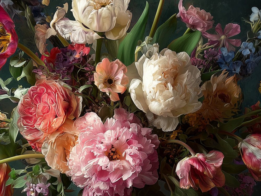 "Floral Reverie - Classic in Bloom" zeigt einen üppigen Strauß aus Tulpen, Rosen und Pfingstrosen vor einem tiefen, dunklen Hintergrund. Die warmen Farben und die klassische Komposition verleihen dem Werk ein elegantes Aussehen, das sowohl in moderne als auch in traditionelle Interieurs passt. Dieses Gemälde ist ideal für Liebhaber von Blumenkunst, Stillleben und anspruchsvoller Dekoration. Perfekt für Wohnräume, Empfangsräume oder Galerien.