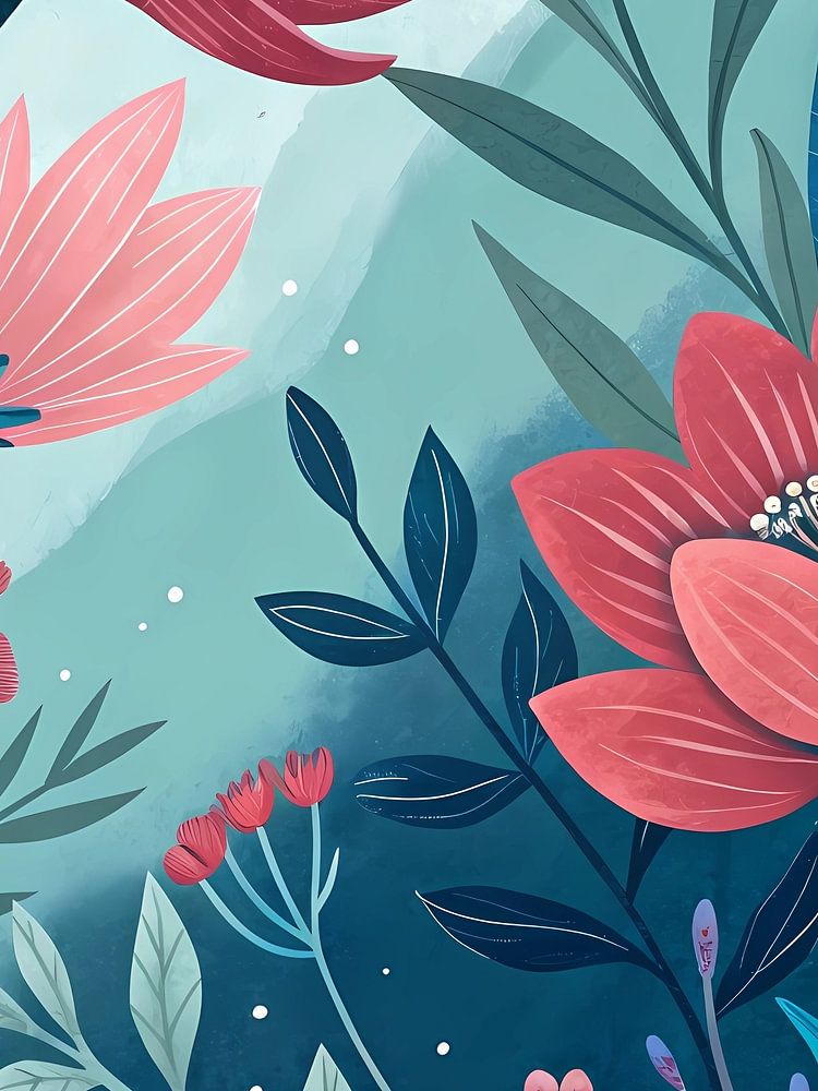 Diese lebendige digitale Illustration zeigt ein stilisiertes Arrangement von verschiedenen Blumen und Blättern in einer reichen Palette von Rot-, Rosa-, Türkis- und Blautönen. Das Kunstwerk zeichnet sich durch kühne, grafische Formen und Texturen aus, die eine moderne und skurrile Blumenszene schaffen. Der Hintergrund hat einen weichen, aquarellähnlichen Anstrich, der der Komposition Tiefe und Atmosphäre verleiht.