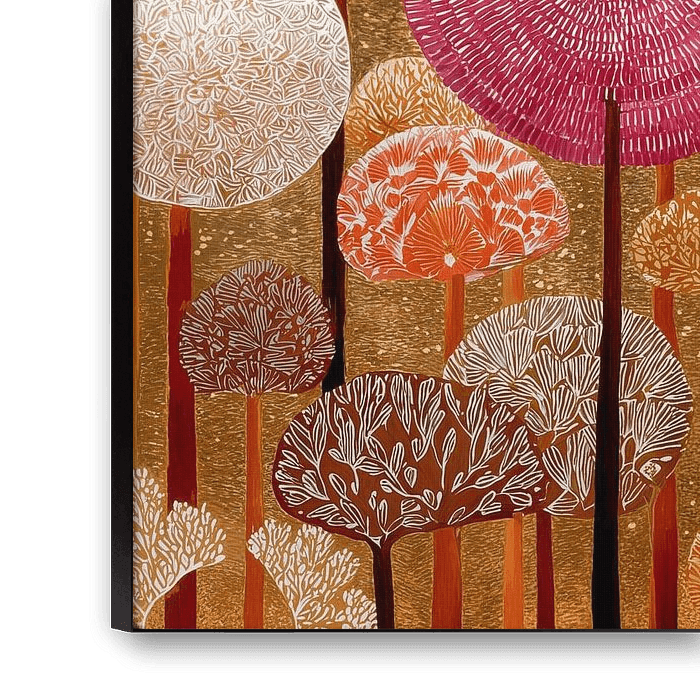 Floral Landscape | Playful Blooms - Dies ist ein Blumenbild mit bunten kreisförmigen Elementen in verschiedenen Schattierungen wie Rosa, Weiß und Orange, die zusammen eine fröhliche und verspielte Landschaft vor einem goldenen Hintergrund bilden.