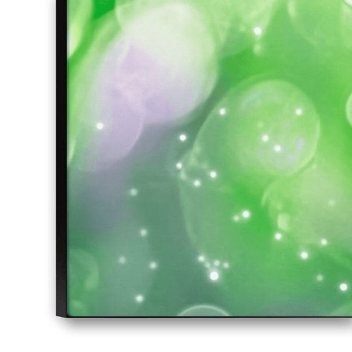 Ein sanfter Farbverlauf aus zartem Grün und lila Tönen umhüllt den Betrachter, während glitzernde Lichtpunkte einen Traum von Frühling erwecken. Diese harmonische Komposition vermittelt eine beruhigende Atmosphäre und eignet sich hervorragend für das Schlafzimmer, wo sie eine entspannte, friedliche Stimmung fördert.