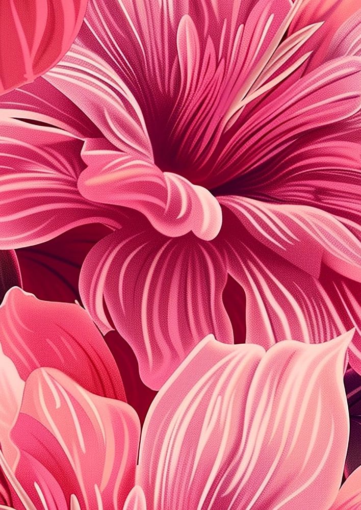 Ein kühnes und lebendiges Muster aus großen, stilisierten Blumen in Rosatönen ziert einen roten Hintergrund. Der Kontrast zwischen den leuchtend rosafarbenen Blütenblättern und dem tiefroten Stoff fällt sofort ins Auge und schafft eine Atmosphäre, die an Vintage-Mode erinnert.
