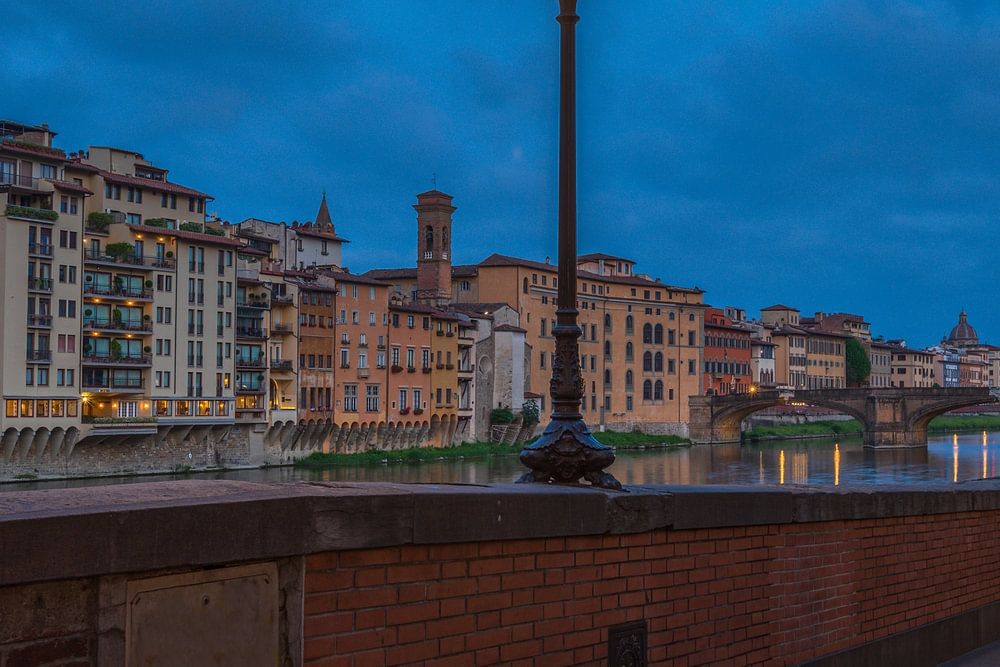 Das Foto wurde früh am Morgen während der blauen Stunde aufgenommen. Direkt hinter mir, dem Fotografen, befindet sich die Ponte Vecchio.