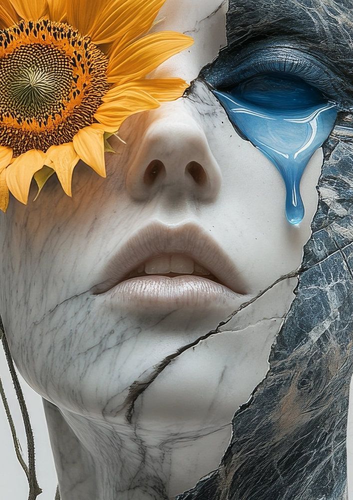 Aus der zerbrochenen Seite einer Statue fließt Wasser, während eine Sonnenblume blüht, ein Symbol für verborgene Gefühle, die in die Welt hinausfließen.