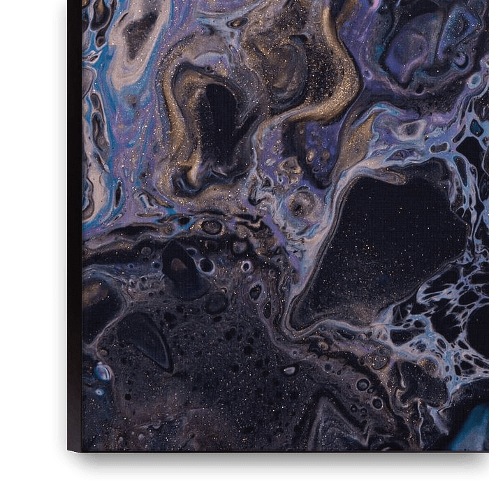 Bestelle dieses abstrakte Wandbild Flüssige Farben: Schwarz, Blau, Lila und andere Farben fließen aneinander vorbei von Marjolijn van den Berg als Reproduktion auf Leinwand, Alu-Dibond, als Poster, Fototapete oder Acrylglasbild.