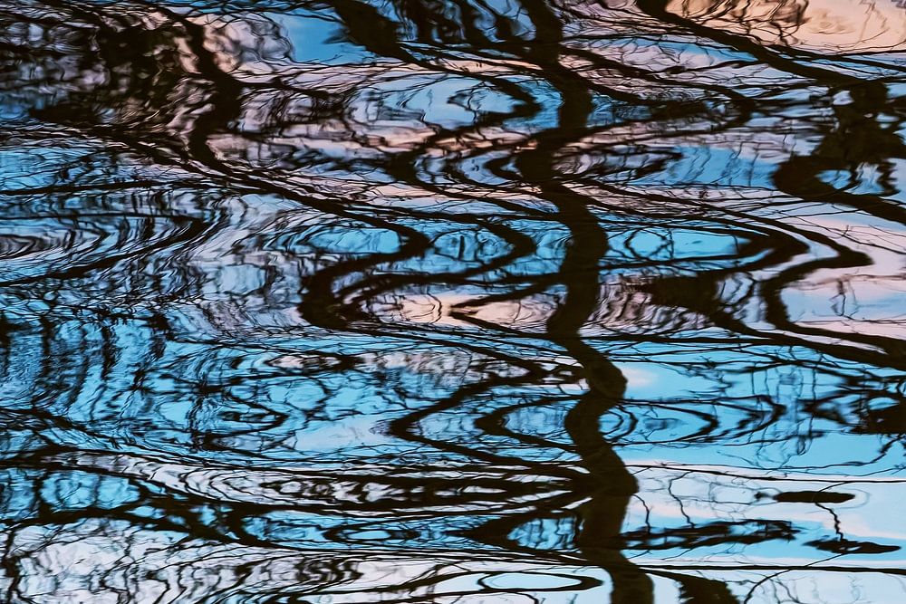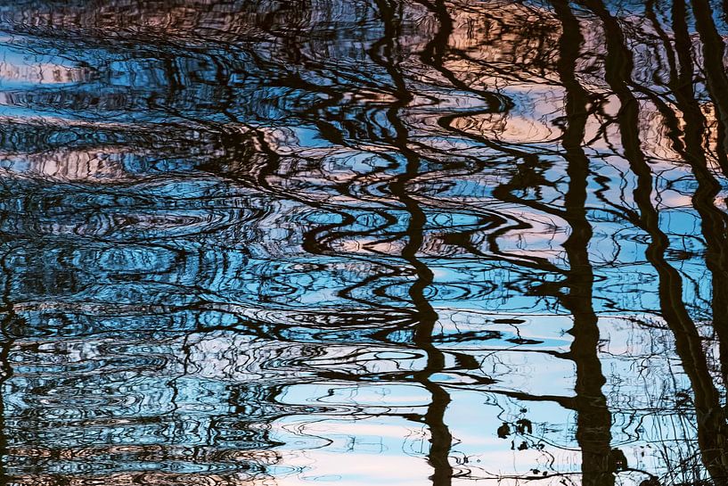 Kahle Bäume lösen sich in welligem Wasser auf und verwandeln Luft und Wald in flüssige Pinselstriche. Das Licht schwankt zwischen kühlem Blau und zartem Pfirsich, während die Oberfläche jede Linie zu etwas Abstraktem und Flüchtigem verzerrt.