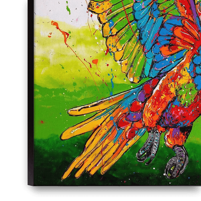 Bewundern Sie die lebhafte Schönheit von "Flight of Colours", einem fesselnden Gemälde, das die Anmut und Lebendigkeit eines Papageis in vollem Flug einfängt. Es ist eine Sinfonie der Farben, die die Fantasie beflügelt.
