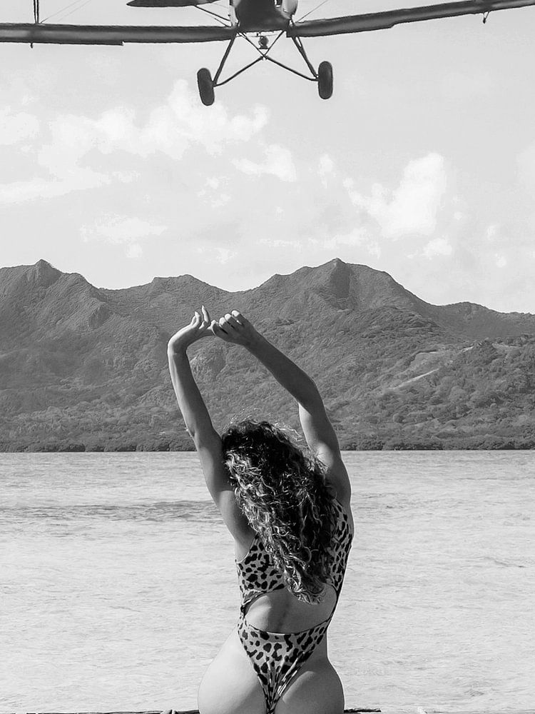 Doppeldecker Flugzeug im Anflug auf eine Insel Landung. Schwarz-Weiß-Fotografie von Flugzeugen - Fotografien. Steady As She Goes. Mädchen im Bikini auf einem Dock sitzend.