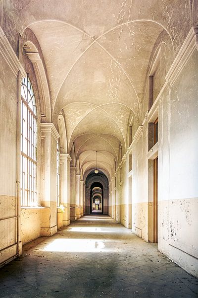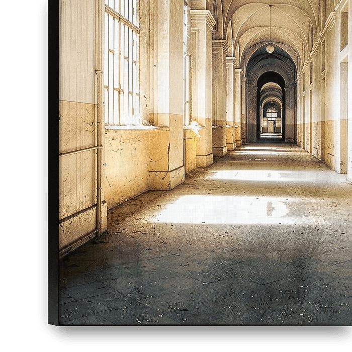 Ein stiller Gang, in dem die Vergangenheit noch leise zu atmen scheint. Das gefilterte Licht fällt durch hohe Fenster und zeichnet ein Spiel aus Schatten und Wärme auf die verwitterten Wände. Die Symmetrie der Bögen führt deinen Blick tiefer ins Unbekannte, als ob jeder Schritt eine Geschichte enthüllt, die einst war. Die Risse, der…