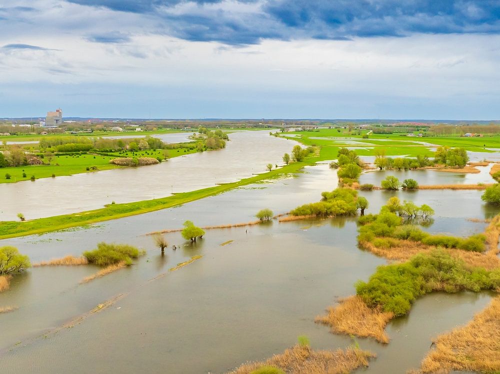 Luftaufnahme der Landschaft entlang des überfluteten Flusses IJssel in der Nähe des Dorfes Zalk in Overijssel. Die Überschwemmungsgebiete sind nach einer Periode starker Regenfälle im Frühjahr flussaufwärts überflutet.