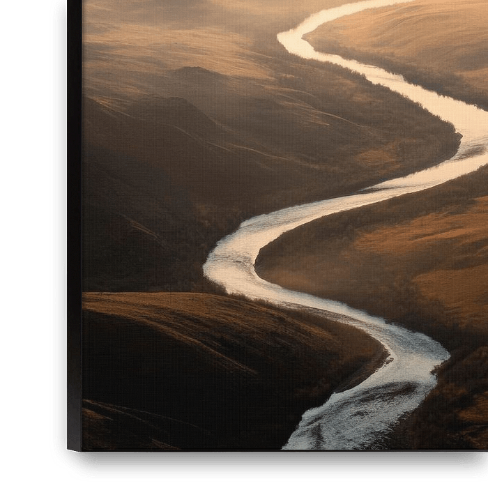 Silbrig schimmert der Fluss, der sich mühelos durch die sanften Hügel schlängelt, während der Morgennebel die Landschaft in sanften Pastelltönen hüllt. Majestätische Berge rücken in den Hintergrund und erzeugen eine Atmosphäre zeitloser Ruhe, während die ersten Sonnenstrahlen das sanfte Chaos der Natur umarmen. Ein Bild, das zum Träumen…