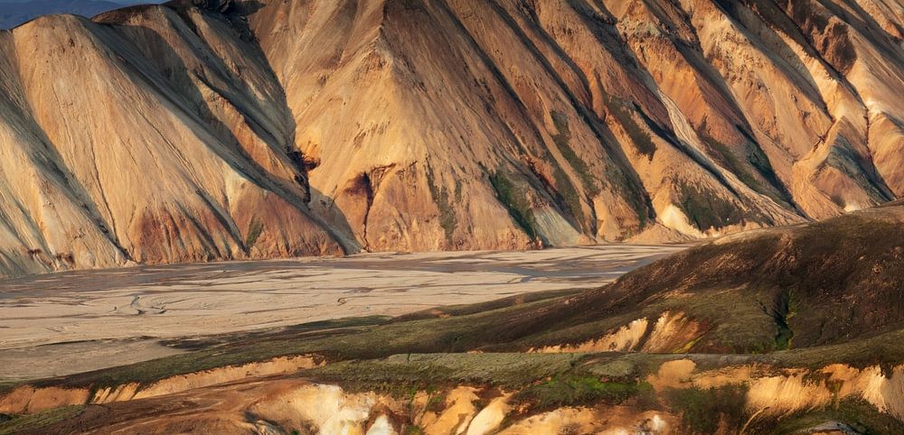 Fluss im Licht des Sonnenuntergangs unter dem Berg Blahnukur in Landmannalaugar, Island